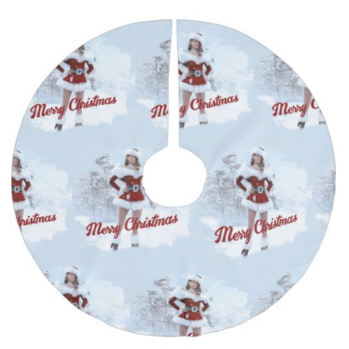 The outfit is vibrant and eye-catching, showcasing the rich red and soft white colors, which contrast beautifully against the snowy backdrop. She wears a matching Santa hat tilted charmingly, enhancing her playful expression. The background features a serene winter landscape, with softly falling snowflakes and a soft, blurred view of snow-covered trees, creating a magical atmosphere.